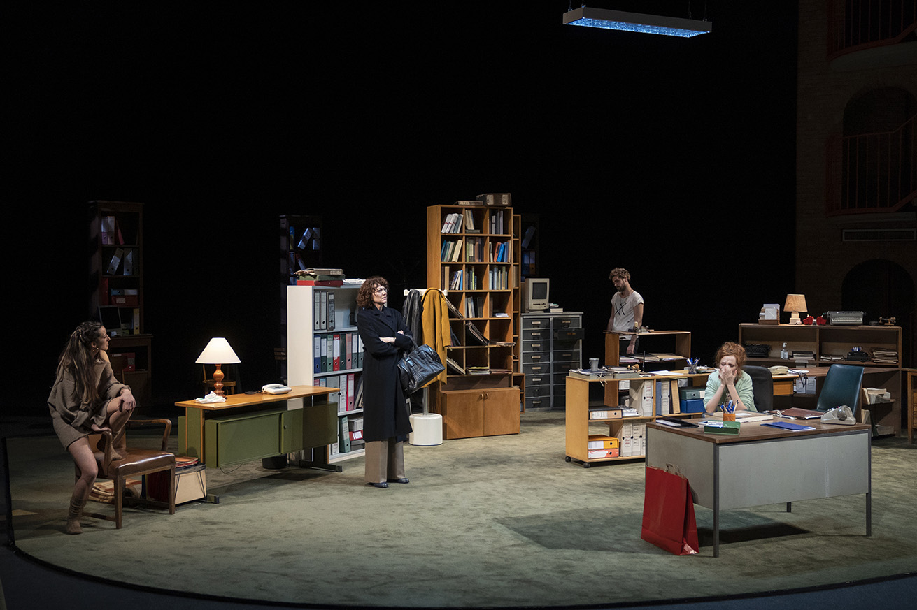 “Le relazioni sentimentali con l’altro o con lo stesso sesso, la genitorialità, le convenzioni sociali, segreti e bugie da custodire o da dire. Tutto è in centrifuga dentro la fissa scenografia-simulacro di un ufficio anni 70-80, che pare appartenere a un’altra dimensione. Il pubblico assiste seduto in poltrona, come se guardasse attraverso un oblò largo quanto il palcoscenico del Teatro Donizetti. Se non si è disposti ad affrontare un percorso di autoanalisi, ci si diverte a sufficienza. Ma la seduta è compresa nel prezzo del biglietto e dura tanto quanto lo spettacolo. Novanta minuti sostenuti, fra risate (amare) e sospiri (profondi), da un brillantissimo cast di interpreti: Rosario Lisma, Stella Piccioni, Valentina Picello, Giorgia Senesi, Luca Tanganelli. Il quintetto impeccabile – sia per il ritmo e i toni con cui rimpalla le battute, sia per come si spartisce lo spazio scenico – dimostra che tutto capita. Così è il teatro. Così è la vita.” Corriere della Sera, Bergamo 8 aprile 2025